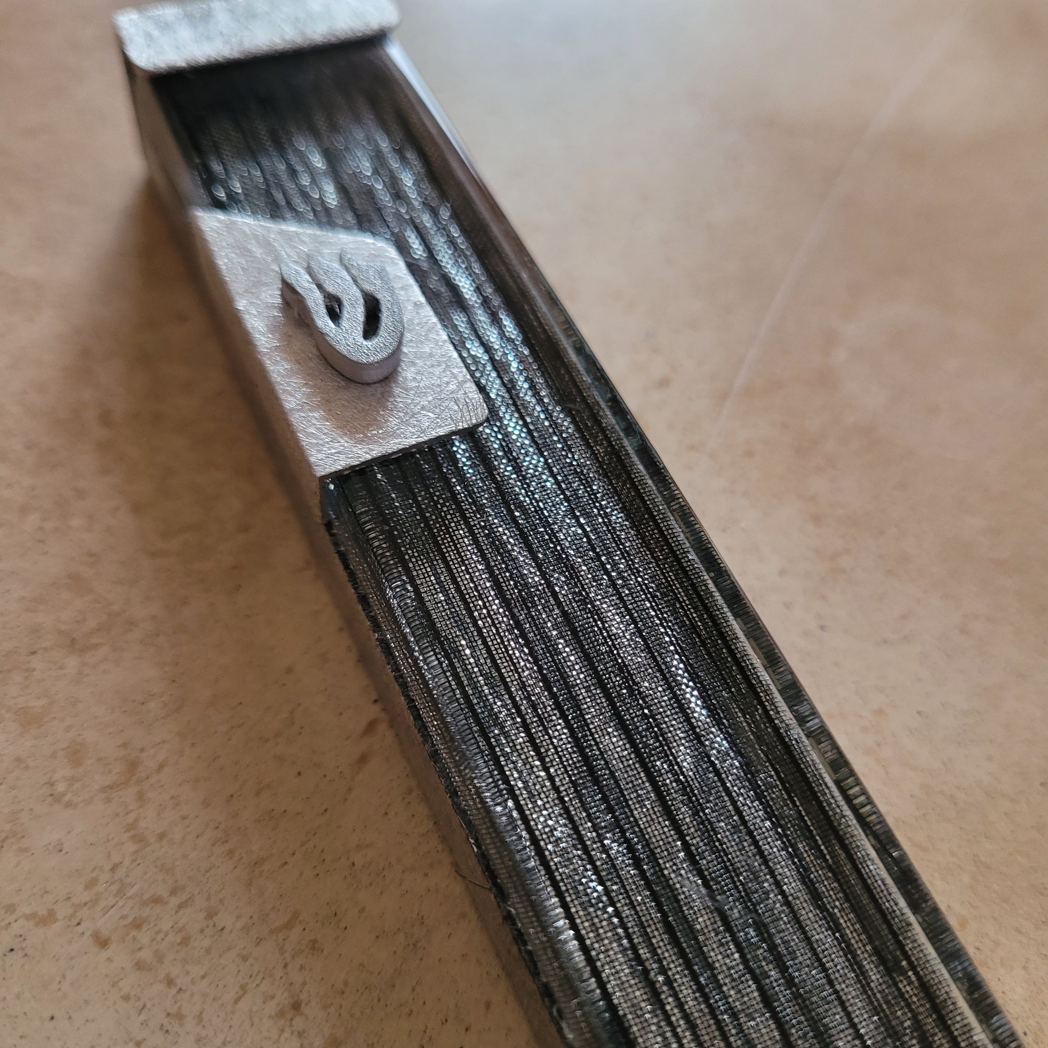 Elegant and understated, this handmade mezuzah by Israeli artist Ben Ruth features a sleek design crafted from shimmering glass with colors of black, gray, and silver and accented with brushed aluminum. Its minimalist aesthetic blends tradition with contemporary style, making it a beautiful addition to any doorway. Thoughtfully designed and meticulously crafted, this mezuzah is perfect for those who appreciate modern design with meaningful roots.