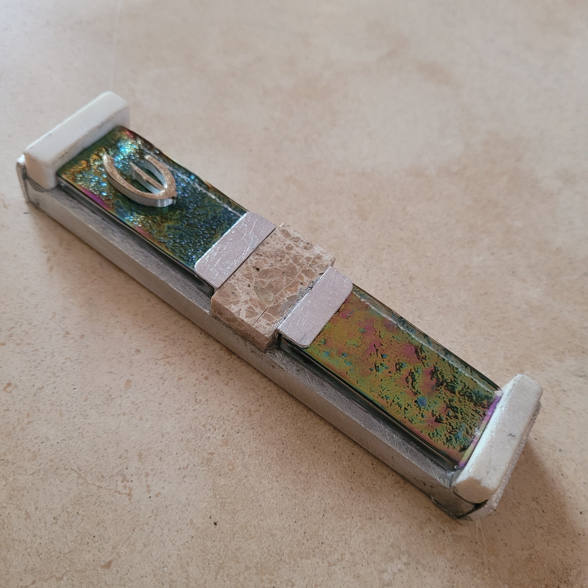Add a touch of elegance and tradition to your home with this handcrafted mezuzah by Israeli artist Ben Ruth. Featuring shimmering iridescent glass, marble, and brushed aluminum detailing. Each piece is uniquely made and beautifully reflects light and color.  A perfect blend of modern design and Jewish heritage, this mezuzah makes a meaningful gift or a beautiful addition to your own space.