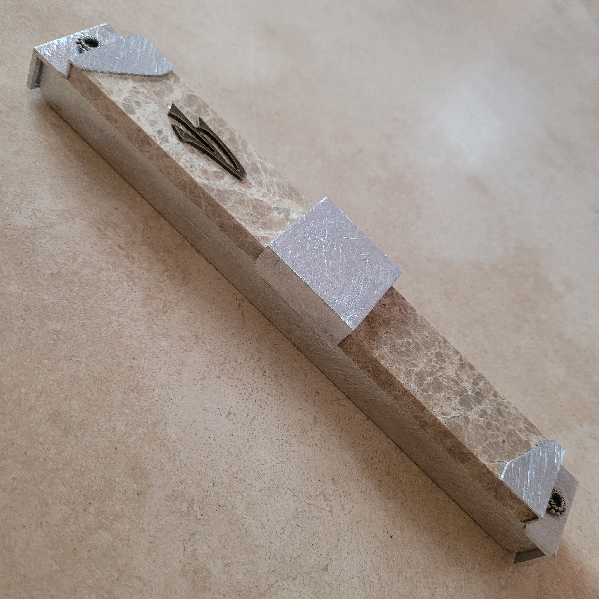 Add a touch of elegance and tradition to your home with this handcrafted mezuzah by Israeli artist Ben Ruth. Featuring polished Jerusalem stone and brushed aluminum. Each piece is uniquely handmade. A perfect blend of modern design and Jewish heritage, this mezuzah makes a meaningful gift or a beautiful addition to your own space.